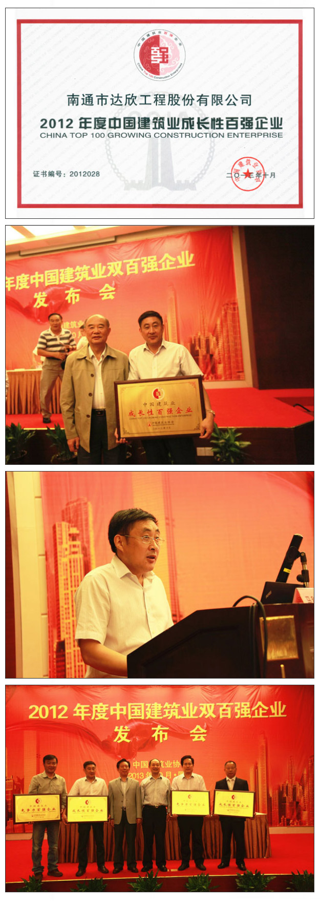 會議發(fā)布了2012年度中國建筑業(yè)雙百強(qiáng)企業(yè),南通市達(dá)欣工程股份有限公司再次入選成長性百強(qiáng)企業(yè)(綜合排名位列第28名,比去年排名提高了21位);會議向2012年度中國建筑業(yè)雙百強(qiáng)企業(yè)頒發(fā)牌證,我公司作為獲獎企業(yè)代表上臺領(lǐng)取獎牌;會議還同時進(jìn)行了中國建筑業(yè)雙百強(qiáng)企業(yè)代表經(jīng)驗(yàn)交流,公司董事長馬和軍作為江蘇地區(qū)代表、作為成長性百強(qiáng)企業(yè)代表在會上作了“砥礪奮進(jìn),拼搏進(jìn)取,實(shí)現(xiàn)企業(yè)新跨越”的經(jīng)驗(yàn)交流。