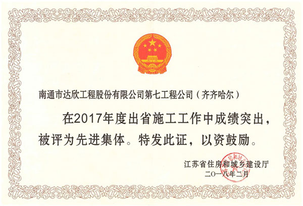 會(huì)議由江蘇省建設(shè)廳駐東北辦主任孫忠健主持,會(huì)議總結(jié)了2017年的工作,部署2018年工作任務(wù);會(huì)議表彰我省2017年進(jìn)東北建筑施工先進(jìn)集體和先進(jìn)個(gè)人,第七工程公司被授予“江蘇省出省建筑施工先進(jìn)集體”、陳貴榮同志被評(píng)為先進(jìn)個(gè)人。