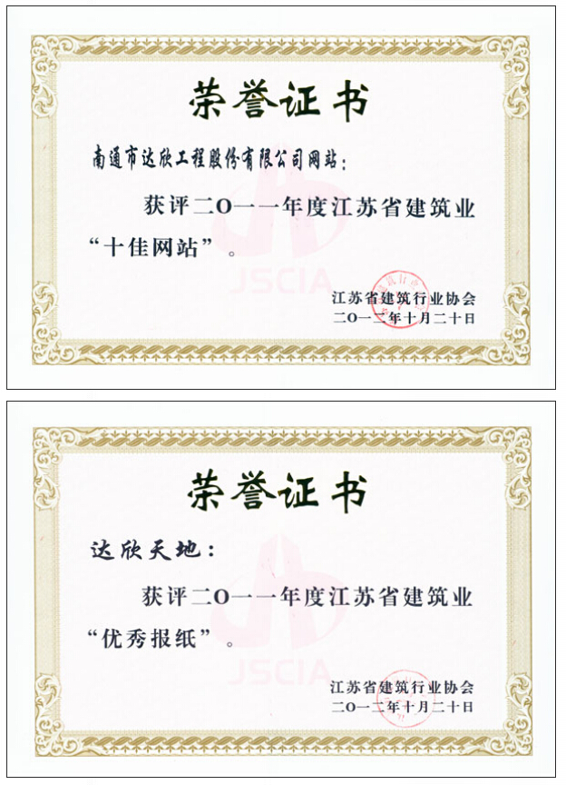 會議同時對2011年度江蘇省建筑業(yè)優(yōu)秀報(bào)、刊、網(wǎng)和優(yōu)秀通訊員進(jìn)行了表彰,南通市達(dá)欣工程股份有限公司網(wǎng)站榮獲江蘇省建筑業(yè)“十佳網(wǎng)站”、“達(dá)欣天地”報(bào)榮獲江蘇省建筑業(yè)“優(yōu)秀報(bào)紙”。