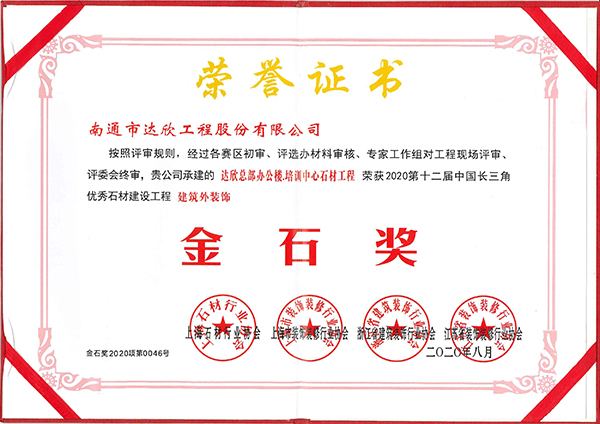 中國(guó)長(zhǎng)三角石材建設(shè)工程“金石獎(jiǎng)”是石材工程領(lǐng)域的奧斯卡金獎(jiǎng),達(dá)欣總部辦公樓培訓(xùn)中心獲此殊榮是對(duì)該項(xiàng)目完美品質(zhì)和公司實(shí)力的充分肯定。我們將以此為動(dòng)力,繼續(xù)打造更多精品工程,為達(dá)欣的發(fā)展增光添彩。
