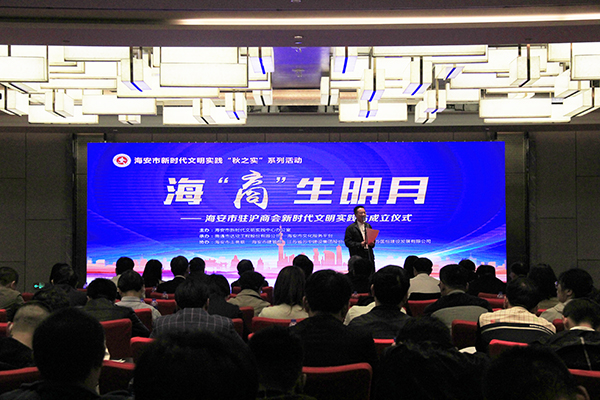 10月29日,海安市駐滬新時(shí)代文明實(shí)踐站成立儀式在上海舉行。江蘇省住建廳駐上海辦事處主任、江蘇省人民政府駐上海辦事處建管處處長趙永強(qiáng),南通市文明辦副主任吳信林;海安市委副書記、黨校校長張浩,海安市委常委、宣傳部長王榮貴,海安市人民政府副市長戴曉晨,以及上海海安商會(huì)全體會(huì)員,海安駐滬流動(dòng)黨員聯(lián)合黨委全體班子成員,海安駐滬建筑企業(yè)負(fù)責(zé)人,各區(qū)鎮(zhèn)街道政工書記、宣傳委員、駐滬招商人員等200多人出席活動(dòng)現(xiàn)場。