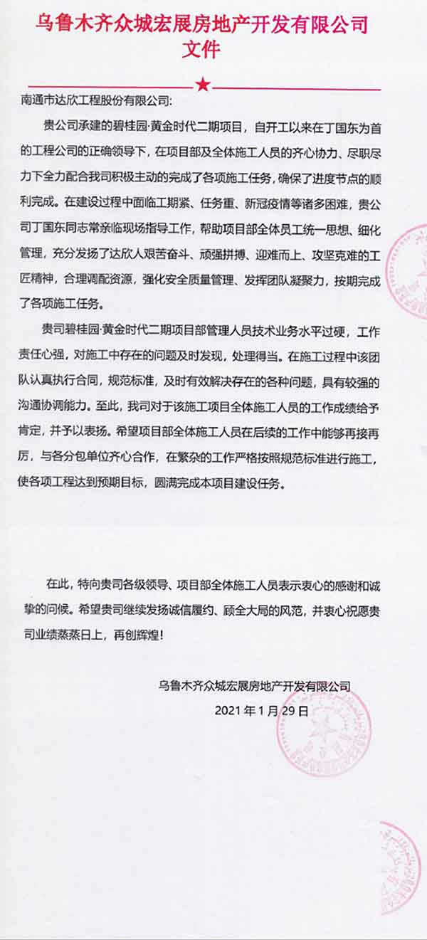 1月29日,集團(tuán)總部收到烏魯木齊眾城宏展房地產(chǎn)開(kāi)發(fā)有限公司對(duì)第十一工程公司的表?yè)P(yáng)信。詳情如下: