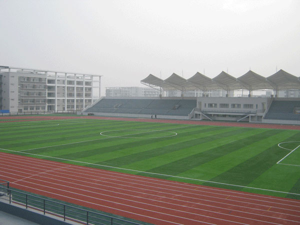 江蘇省海安縣職業(yè)教育中心校體育場(chǎng)為400米塑膠田徑運(yùn)動(dòng)場(chǎng)工程,田徑場(chǎng)占地面積16999m2,主看臺(tái)長(zhǎng)150米,寬17.5米,輔看臺(tái)長(zhǎng)104米,寬10米。主看臺(tái)占地面積為2173.4m2,輔看臺(tái)占地面積為1008m2,田徑場(chǎng)跑道為混合型塑膠面層,中間足球場(chǎng)為進(jìn)口人工草皮,周邊輔助區(qū)為人工草皮。該體育場(chǎng)的建成將為海安群眾性體育活動(dòng)的開展提供便利。