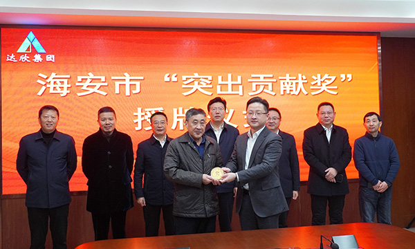 12月1日,海安高新區(qū)黨工委書記鄧加忠,黨工委副書記、管委會主任魯斌,黨工委副書記、科創(chuàng)園主任陸建銀,管委會副主任徐愛軍等領(lǐng)導(dǎo),為企業(yè)“2021年度入庫稅金超億元”,舉行“突出貢獻獎”授牌儀式。這是繼去年集團榮獲此項獎牌后,再次受到當?shù)卣挠忠淮渭为劰膭?。集團領(lǐng)導(dǎo)馬和軍、劉厚純等出席授牌儀式。