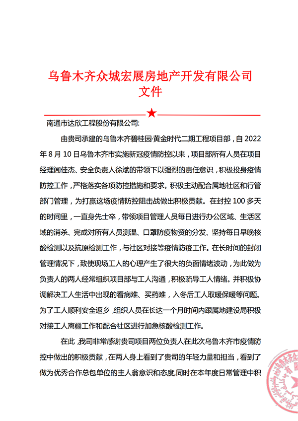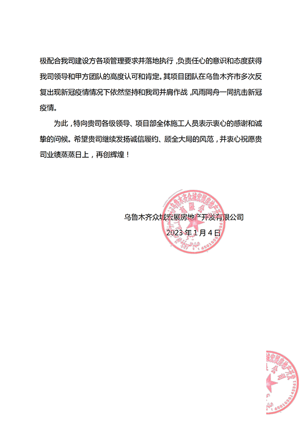 1月10日,集團公司收到來自烏魯木齊眾城宏展房地產(chǎn)開發(fā)有限公司的一封表揚信,信中對集團第十一公司烏魯木齊碧桂園·黃金時代二期工程項目部,自2022年8月10日烏魯木齊市實施新冠疫情防控以來,項目部全體人員在疫情防控和項目建設中表現(xiàn)出的責任與擔當表示感謝。內(nèi)容詳見附件: