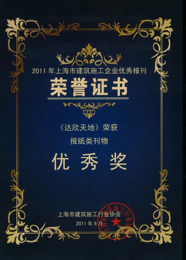 2011年上海市建筑施工企業(yè)優(yōu)秀報刊及協(xié)會優(yōu)秀通訊員表彰會日前召開,由上海市建筑施工企業(yè)優(yōu)秀報刊評委會評選,公司創(chuàng)辦的“達欣天地”報榮獲2011年上海市建筑施工企業(yè)優(yōu)秀報刊獎。
