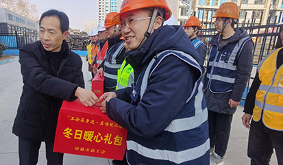 1月13日,南通市總工會(huì)黨組成員、經(jīng)審會(huì)主任周正秋,南通市總工會(huì)權(quán)益保障部部長(zhǎng)趙周恒一行,來到達(dá)欣集團(tuán)南通R23005地塊項(xiàng)目建設(shè)現(xiàn)場(chǎng),開展“工會(huì)在身邊 真情暖江海”2025年春節(jié)送溫暖活動(dòng),為奮戰(zhàn)在一線的工作人員送上冬日暖心禮包和新春的祝福與慰問。