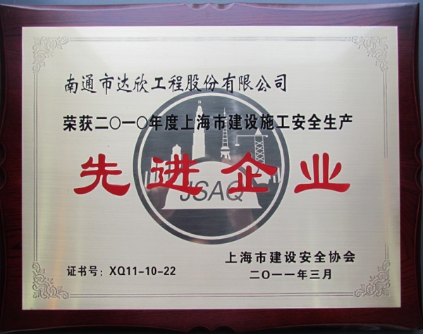 日前南通市達(dá)欣工程股份有限公司被上海市建筑安全協(xié)會評為“二0一0年度上海市建設(shè)施工安全生產(chǎn)先進企業(yè)”。這是第一工程公司連續(xù)四年獲此殊榮。