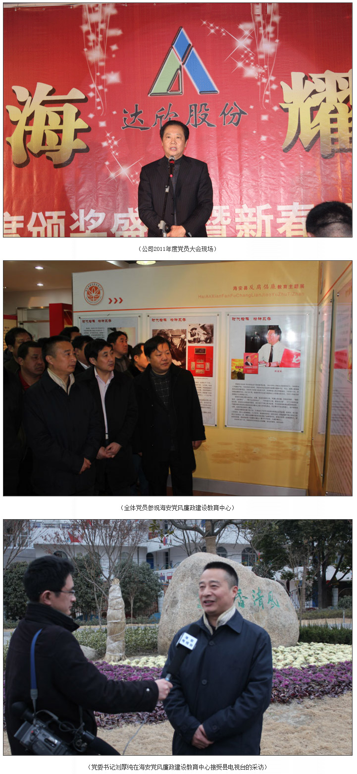 會議由公司董事長、黨委副書記馬和軍同志主持,上午在進(jìn)行了4名預(yù)備黨員同志入黨誓詞、各支部推薦的7名優(yōu)秀黨員后,盧榮翔書記對公司全體黨員進(jìn)行了冬訓(xùn)補(bǔ)課講座,他從家鄉(xiāng)的建設(shè)發(fā)展、建筑業(yè)面臨的發(fā)展機(jī)遇等進(jìn)行了講述,并對公司的未來發(fā)展方向提出了要求與希望,勉勵全體黨員要在科學(xué)觀的引領(lǐng)下,積極開展創(chuàng)先爭優(yōu)活動,為達(dá)欣的強(qiáng)勁發(fā)展做出應(yīng)有的貢獻(xiàn)。接著公司黨委書記劉厚純同志作了題為“揚(yáng)帆起航聚心力,創(chuàng)先爭優(yōu)求發(fā)展”2010年黨建總結(jié)暨2011年黨建工作要求的報(bào)告,報(bào)告從突出黨組織建設(shè),發(fā)揮堅(jiān)強(qiáng)的堡壘作用、突出生產(chǎn)經(jīng)營建設(shè),為企業(yè)發(fā)展助力升威、突出改革創(chuàng)新理念,發(fā)揮黨員引領(lǐng)作用、突出“創(chuàng)先爭優(yōu)”活動主題,營造積極向上的企業(yè)氛圍等六個方面對2010年進(jìn)行了總結(jié),對2011年的黨建工作目標(biāo)、工作重點(diǎn)、工作舉措進(jìn)行了闡述,要求全體黨員同志要進(jìn)一步增強(qiáng)政治意識、責(zé)任意識、創(chuàng)新創(chuàng)優(yōu)意識、大局意識,為公司全面完成2011年各項(xiàng)工作任務(wù)而共同努力!