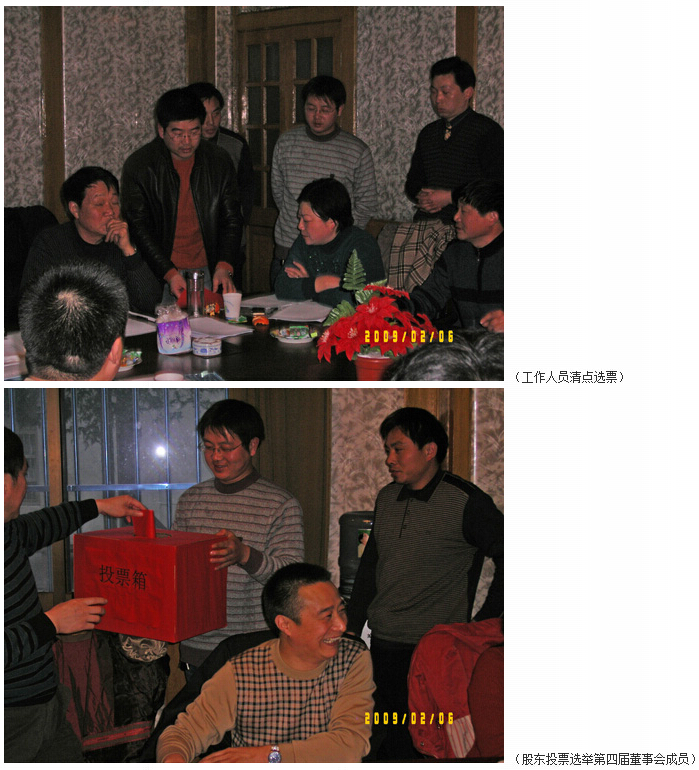 大會(huì)通過無記名投票方式,選舉產(chǎn)生了四屆董事會(huì)和監(jiān)事會(huì)成員各5名。丁興元、馬和軍、劉厚純、徐仁忠、溫鶴華等5名董事又推選馬和軍同志任董事長、劉厚純同志任副董事長,董事長馬和軍同志聘任丁興元、徐仁忠、溫鶴華3名同志為副總經(jīng)理。丁兆祥、王建國、楊靜、徐俊、謝果生等5名監(jiān)事推選謝果生同志任監(jiān)事會(huì)主席。董事長馬和軍同志發(fā)表了熱情洋溢的講話,堅(jiān)信在上級黨委政府、各位股東、總支書記以及全體員工的大力支持下,有決心和信心把達(dá)欣公司發(fā)展好,發(fā)展得更快。