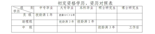 1、初定條件:大中專畢業(yè)生在所學(xué)專業(yè)與所從事工作的專業(yè)相同或相近的前提下,具備以下國(guó)家規(guī)定的相應(yīng)學(xué)歷、從事專業(yè)技術(shù)工作年限(表中簡(jiǎn)稱“技齡”)的,可申請(qǐng)初定相應(yīng)級(jí)別的專業(yè)技術(shù)資格: