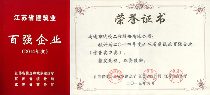 為充分發(fā)揮優(yōu)勢企業(yè)在全行業(yè)中的引領(lǐng)和示范作用,打造建筑企業(yè)品牌,提升核心競爭力,省住房城鄉(xiāng)建設(shè)廳、統(tǒng)計局、商務(wù)廳成立了“百強企業(yè)”認定委員會,本著“尊重事實、嚴格標準、規(guī)范程序、公平公正”的原則,組織開展了2014年度建筑業(yè)“百強企業(yè)”(企業(yè)包括總承包綜合實力類、建筑裝飾裝修類、建筑鋼結(jié)構(gòu)類、建筑安裝類、基礎(chǔ)設(shè)施類等)認定工作。經(jīng)評議,公司首度榮登2014年江蘇省建筑業(yè)“百強企業(yè)”。按照《江蘇省建筑業(yè)企業(yè)信用綜合評價辦法》(蘇建建管〔2013〕602號)文件精神,自發(fā)布之日起的一年內(nèi),“百強企業(yè)”可在施工企業(yè)信用考評中做為省級獎項予以加分。