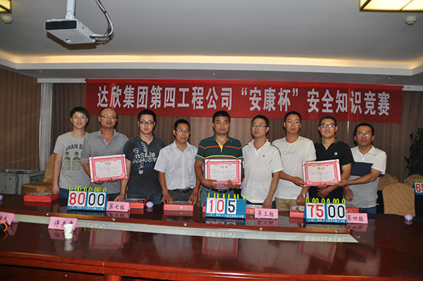 各項目部在建筑物上懸掛安全生產(chǎn)宣傳標語24條幅;組織廣大職工觀看建筑施工中的事故案例,結合施工過程中的實際情況進行分析點評;對全體職工進行了血壓檢測;舉行了“安全生產(chǎn)月”主題簽名活動。工程公司于6月8、9日在留村項目部組織所有在崗管理人員進行了安全知識培訓。6月22日工程公司舉行了“安康杯”安全知識競賽,24名選手分8組參賽。經(jīng)過必答題、搶答題、附加題3個環(huán)節(jié)的比拼,最終眾美綠都項目部以領先笫二名25分的優(yōu)勢獲得冠軍,拉斐小鎮(zhèn)、留村莊園A區(qū)分獲二、三名。通過以上活動的開展,進一步提高了廣大職工的安全生產(chǎn)知識和安全意識,確保安全生產(chǎn)。