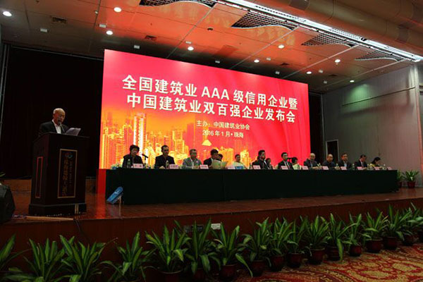 2016年1月7日,為展示全國建筑業(yè)AAA級信用企業(yè)和中國建筑業(yè)雙百強企業(yè)品牌形象,弘揚誠信經(jīng)營、追求卓越的行業(yè)風(fēng)氣,中國建筑業(yè)協(xié)會在珠海召開2015年度全國建筑業(yè)AAA級信用企業(yè)暨2014年度中國建筑業(yè)雙百強企業(yè)發(fā)布會。中國建筑業(yè)協(xié)會會長王鐵宏、副會長兼秘書長吳濤出席會議,副秘書長李蓬主持會議。廣東省住房城鄉(xiāng)建設(shè)廳黨組副書記、巡視員陳英松致歡迎辭,各地區(qū)和有關(guān)行業(yè)建設(shè)協(xié)會和企業(yè)代表等共400余人參會。
